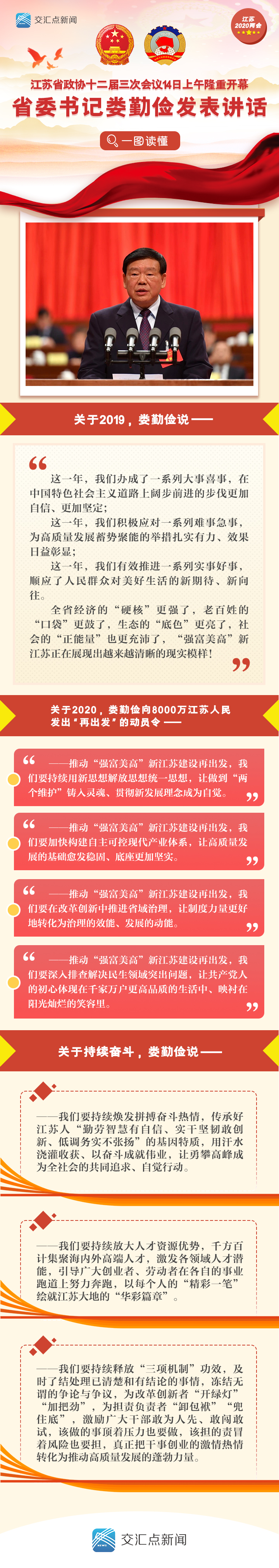 娄勤俭指出,2020年是一个具有里程碑意义的时间节点,“两个百年”目标在这里交汇,两个“五年规划”在这里交接,推进“强富美高”新江苏建设也从这里重整行装再出发。我们要坚决贯彻党中央大政方针,全面落实省委十三届七次全会决策部署,在“两个大局”的交织激荡中勇立潮头,在抓住用好机遇中创造新的更大机遇,在有效应对挑战中开拓新的发展局面,以再出发的坚韧和执着,一年接着一年干,把“强富美高”新江苏的宏图伟业不断推向前进。
