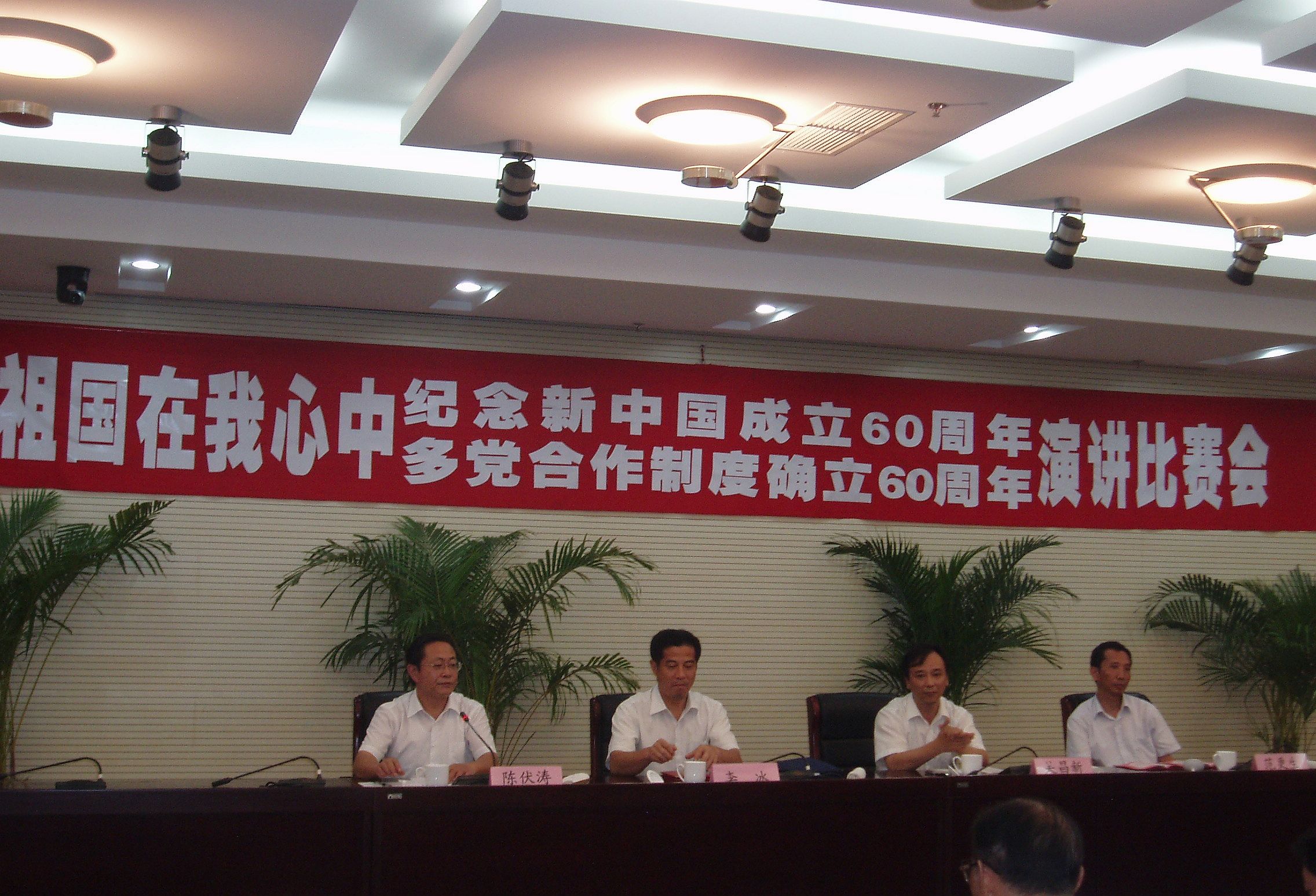 8月27日下午,九三淮安市委召开全体社员大会,隆重举办“祖国在我心中——纪念新中国成立60周年暨多党合作制度确立60周年”演讲比赛会,11名九三社员参加了演讲。市人大常委会副主任、九三学社淮安市委主委李冰,市委统战部王子政副部长和丁在新副部长参加了会议,社市委会陈伏涛副主委主持了会议。
