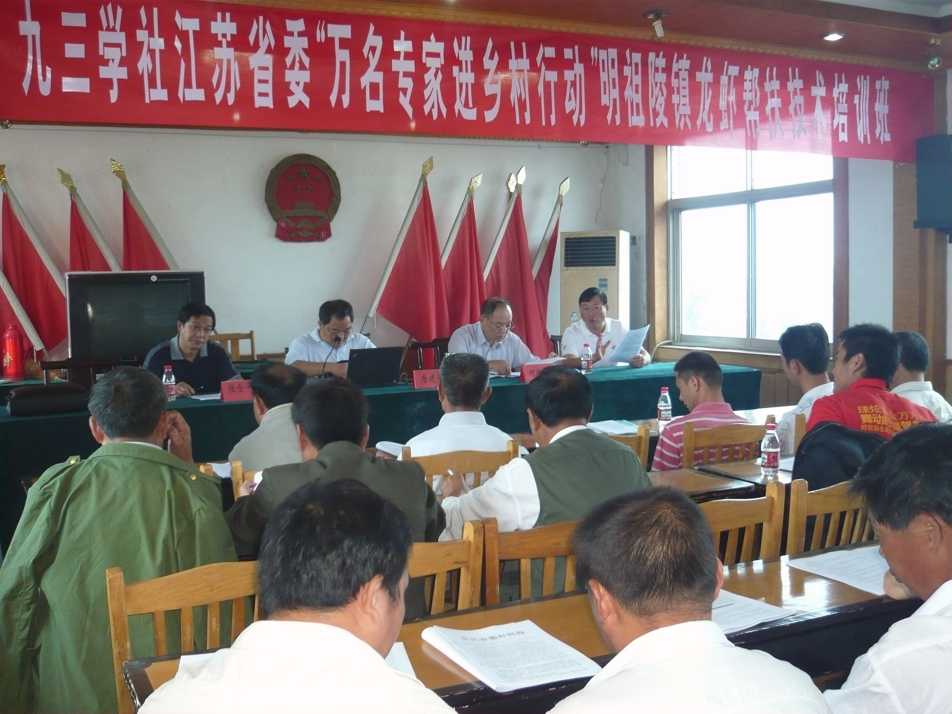 九三学社科技培训班同时开班,来自江苏省淡水水产研究所、中国药科大学的三名专家对水产养殖大户进行了培训,现场深入的就当前龙虾养殖、螃蟹饲养、饲料繁育等方面进行深入交流。此举受到当地政府和广大农户的欢迎,解决了水产养殖的诸多问题。九三市委并向养殖大户赠送了水产养殖技术光盘,还与明祖陵镇政府领导商讨了三年科技服务计划。