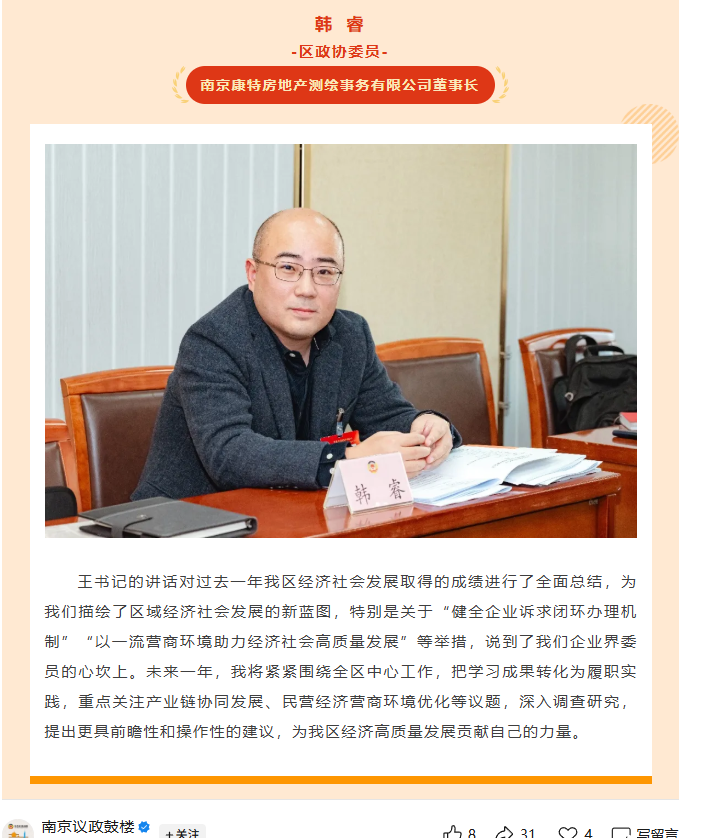 2025年,代表、委员们紧扣鼓楼区委、区政府中心任务,在履职征程上取得了可喜的成绩。王睿撰写的提案《关于完善区产业基金运作模式的建议》被列入区政协领导督办件,同时获得2025年“招商促发展”突出贡献委员,其先进履职事迹在《新华日报》专刊登载;徐国建撰写的提案《关于将中山北路249号住宅楼列入出新计划的建议》受到区委、区政府高度重视,相关部门积极参与落实,相关楼宇面貌现已实现根本性改善;蒲忠良、胡明亮、庞宗强、王菊、徐国建等委员履职高得分受到大会表扬;蒲忠良、王睿开展的各项慈善活动,获得区政协好评及社区居民的称赞。