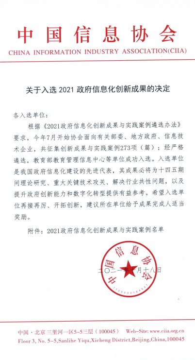 10月22日,由中国信息协会(CIIA)主办的2021政府信息化大会在北京顺利召开。本次大会以“数字赋能 让服务和治理更智能”为主题,“十四五”规划为引领,邀请到政府嘉宾、专家学者、知名企业领袖等代表,围绕“加快数字化发展,激活数据要素潜能,建设数字政府等核心议题”进行深入交流研讨,九三学社社员樊龙华应邀参会研讨。本次大会还公布了《2021政府信息化创新成果与实践案例》,樊龙华参与研究的课题项目“深入应用信用大数据 赋能政府数字化转型研究”荣获“2021政府信息化管理创新奖”。