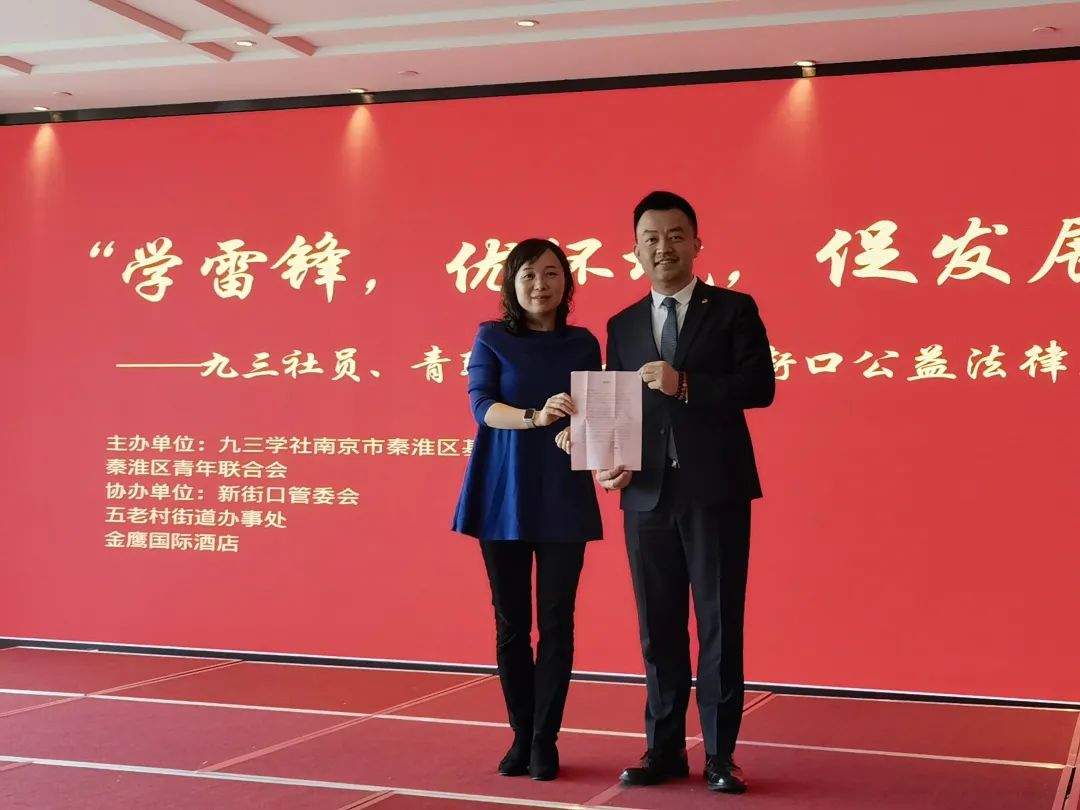 3月4日上午,九三学社秦淮区基层委员会邀请部分社员律师走进新街口商圈,开展“学雷锋,优环境,促发展” 公益法律服务,并就商圈发展座谈交流。社南京市委专职副主委盛俭,区委统战部副部长、区工商联党组书记陈海波,共青团秦淮区委副书记刘锴,社市委秘书长李云勤等领导参加了此次公益服务活动。