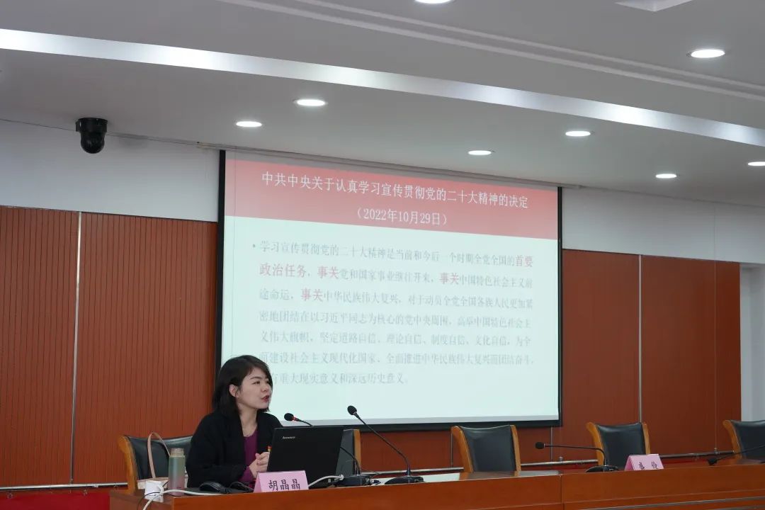 会上,王小姗带领大家集体学习了九三学社第十二次全国代表大会精神。随后,中共南京市委党校的胡晶晶教授围绕着中共二十大的主题和主要成果、过去五年的工作和新时代十年的伟大变革、开辟马克思主义中国化时代化新境界、中国式现代化的中国特色和本质要求等方面,对党的二十大提出的新思想新论断、作出的新部署新要求作了全面系统深入的宣讲解读,为大家带来了一场生动的学习报告。