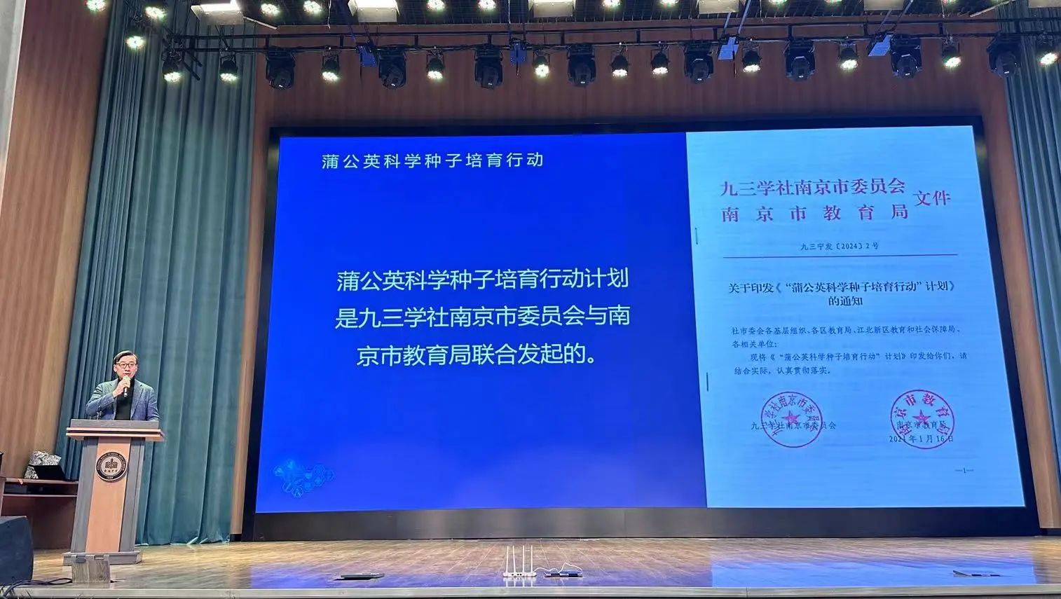 1月22日,九三学社南京市委员会联合市教育局在金陵中学河西分校大礼堂举办“蒲公英科学种子培育行动”启动仪式,活动由社市委会社会服务工作委员会、文化教育工作委员会、科技工作委员会共同筹划,中国科学院院士、南京大学物理系教授都有为,社市委会专职副主委盛俭,市科协副主席刘启祥,市教育局一级巡视员卢普新等领导和嘉宾出席,专委会负责同志徐月红、孙继红和金陵中学河西分校师生、科普基地代表、专委会委员等参加了活动。