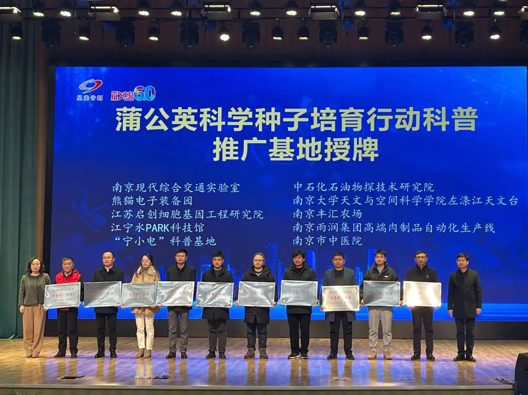 随后,都有为、盛俭、刘启祥、卢普新与南京现代综合交通实验室副主任李文明、南京市长江路小学党总支书记曹海永共同上台进行了启动仪式。盛俭、卢普新为首批确定的10家“蒲公英科学种子培育行动科普推广基地”授牌。