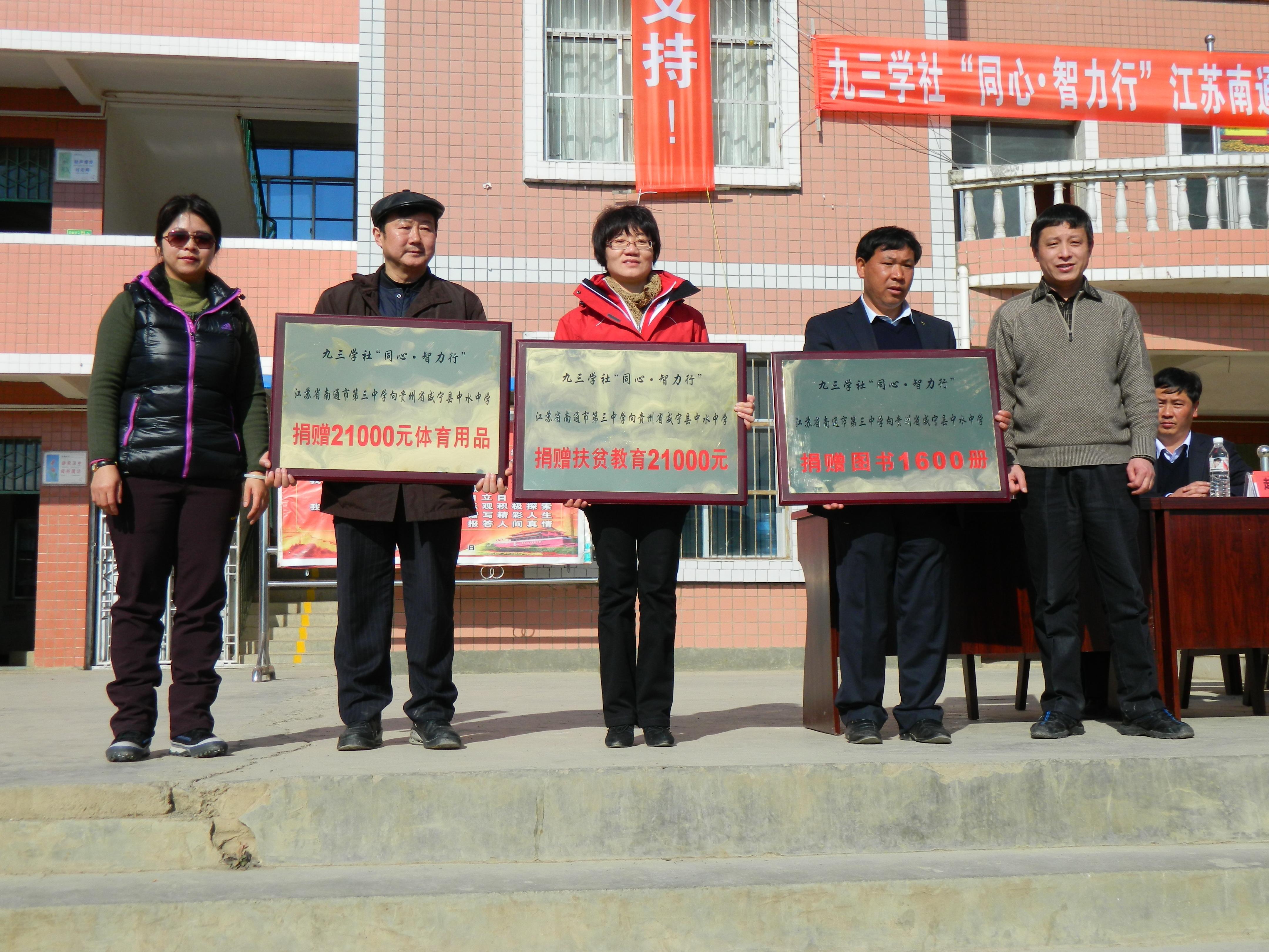2012年12月28日贵州威宁县中水中学操场欢腾一片,节日气氛温暖了在场的每一位师生,现场隆重举行了九三学社同心智力行江苏南通代表团向中水中学结对帮扶捐赠仪式。在江苏省南通市三中的大力支持下,共向学校捐赠了1600册图书和价值21000元的体育用品,并向品学兼优的21名优秀贫困初、高中学生捐赠扶贫教育资金21000元。同时,江苏省南通市第三中学的4位师德典型、优秀骨干教师为中水中学的学生和老师分别上了初中英语、化学和高中语文、数学等示范公开课,授课老师充满激情宣讲、抑扬顿挫的语调、绘声绘色的讲授,让听课的学生聚精会神,也让观摩的威宁县各校的教师赞不绝口。期间,还针对贵州威宁新课改中遇到的困惑和难点,举办了《新课程改革的实践与思考》专题学习报告会,把南通市在新课程改革中的成功经验和“三单”教学方法进行了传授,提升他们在驾驭课堂、优化教研等方面的专业化管理水平。社市委副主委、南通大学电气工程学院副院长吴建国还为中水中学师生举办了一场关于电气工程的科学报告会。