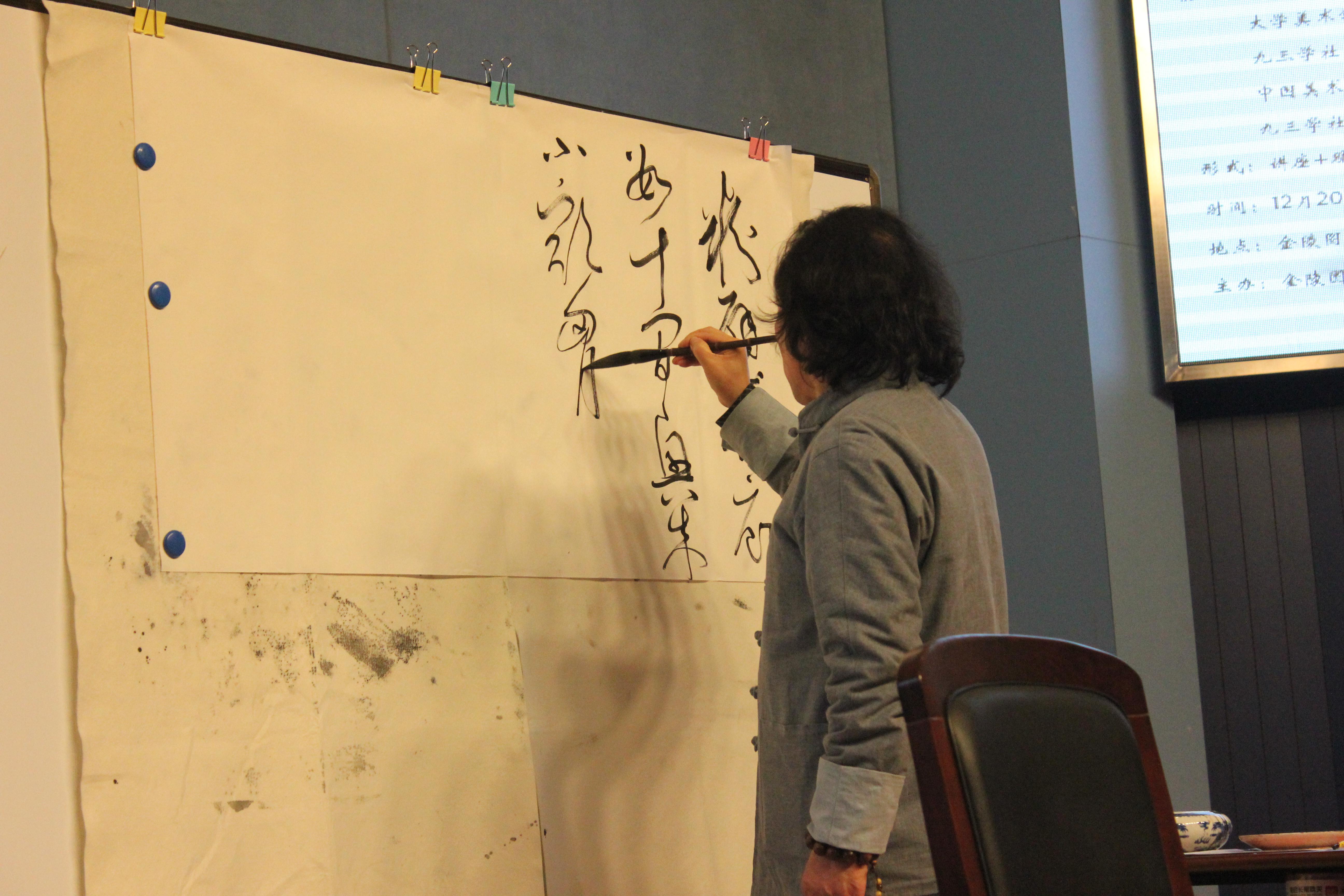 张德林老师,从中国书法传统、审美精神、书写要领,进行了详略有致的演讲,边演示边讲解,最后,收场创作了一副精美的书法作品,赢得了热烈的掌声。