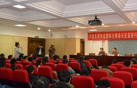 欢迎仪式后,中国象棋国际特级大师徐天红为在场的师生介绍了中国象棋的历史沿革与现行赛事制度,阐明了象棋中的人生哲理,并与学生进行了交流互动。