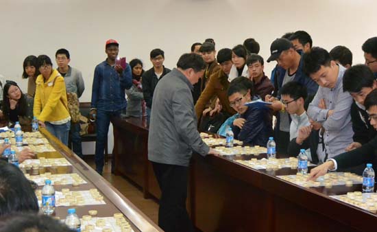 随后,徐大师与在场的教工及学生棋手代表进行了一对十五的 “车轮大战”,最终徐大师以十四胜一和的战绩结束了比赛。比赛过程中,徐大师亲自指点棋艺,众多参赛棋手都受益匪浅。