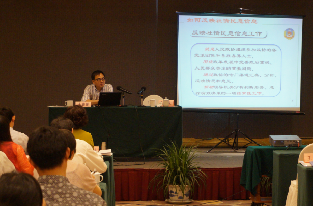 根据2015年社省委工作安排,为进一步提高成员的党派意识,增强撰写社情民意的技巧,扎实做好社情民意信息工作,5月21-23日,社省委社情民意信息培训班在扬州举办。社省委叶勇副主委全程参加培训,为新一届社省委46名特约信息员代表颁发聘书并做讲话,省政协研究室副主任金建明、省委统战部办公室鞠华同志应邀到班作专题辅导,中央统战部舆情评议员龚震应邀为学员点评信息。社扬州市委孙怀昌主委到班祝贺并致辞,各市委会、省直工委推荐的68名信息骨干参加培训。