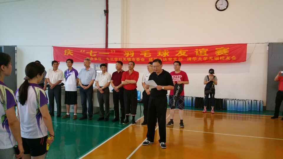 首先由九三学社无锡市委会专职副主委任克奇致开幕辞:感谢各位领导、各位队员冒雨来参加本次羽毛球友谊赛,这次比赛有三支参赛队伍,分别是:九三学社羽毛球代表队、威孚力达羽毛球代表队、清华无锡校友会羽毛球代表队。这次比赛得到了威孚力达党支部的大力支持,感谢他们的大力支持与赞助。也感谢各支队伍积极组队来参加此次友谊赛。江苏省政协副秘书长、九三学社江苏省委会专职副主委、清华校友会江苏省副会长叶勇在致辞中说:我是最特殊的一个,我首先是清华人,是校友会的一员,又是九三人,是九三学社的一员,同时我又与威孚有过科研项目合作的经历。与三方都有着不解的情缘。能够参加这个活动心情非常高兴。叶主委祝愿此次友谊赛赛出精神、赛出友谊。希望大家结交更多的朋友,希望更多优秀的无党派清华校友与威孚精英加入到九三学社队伍中来。