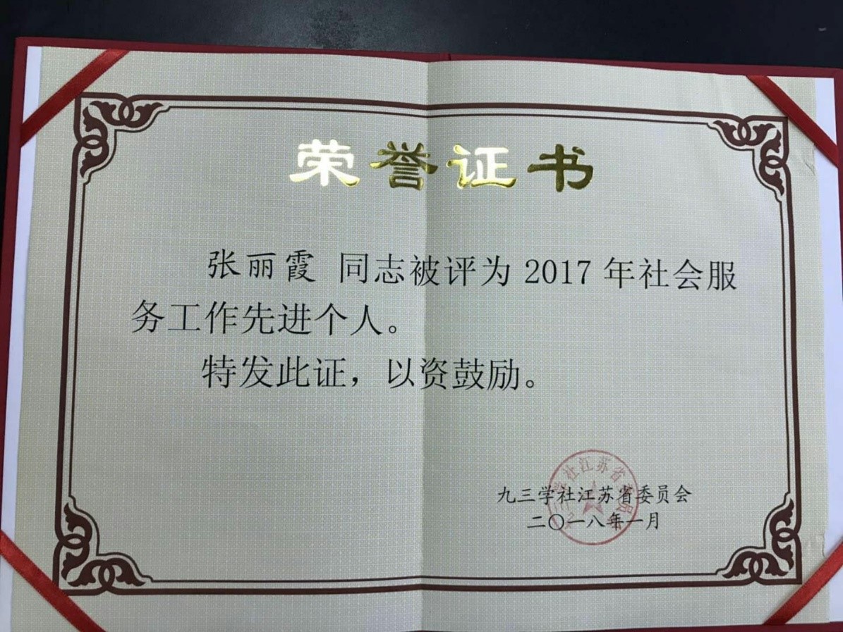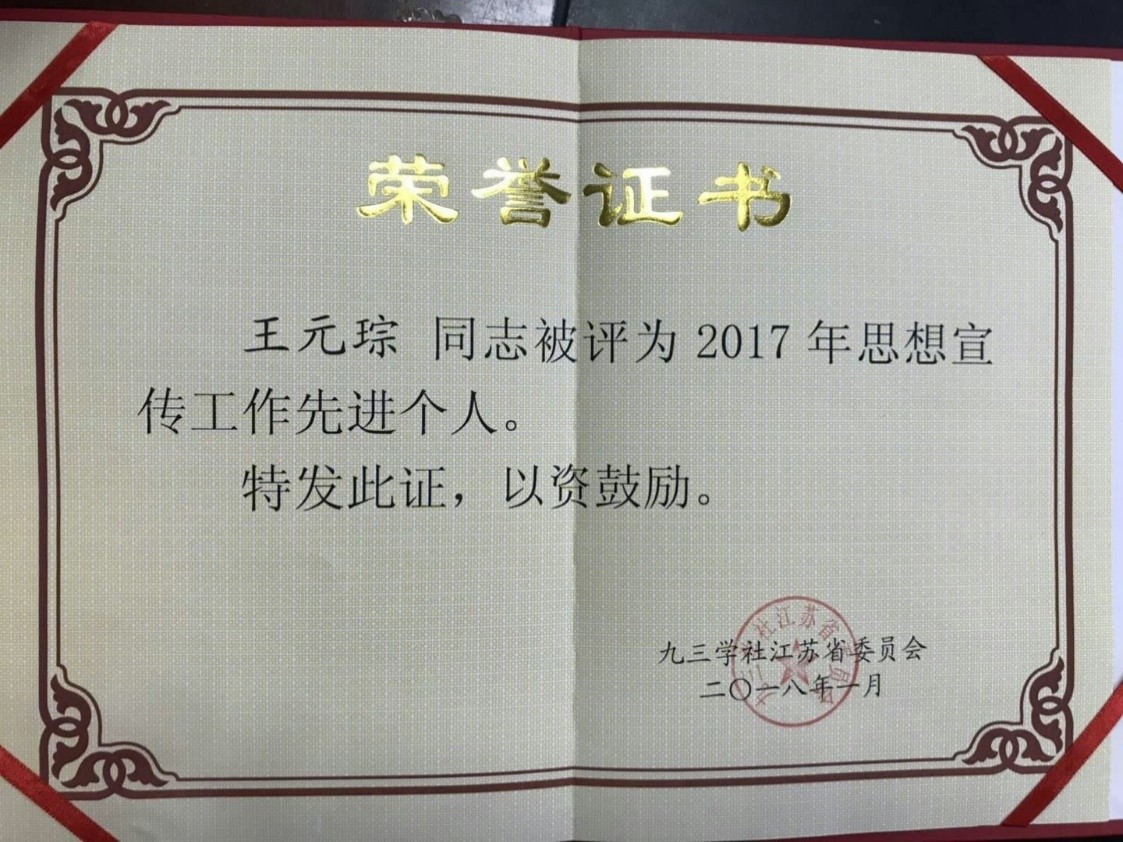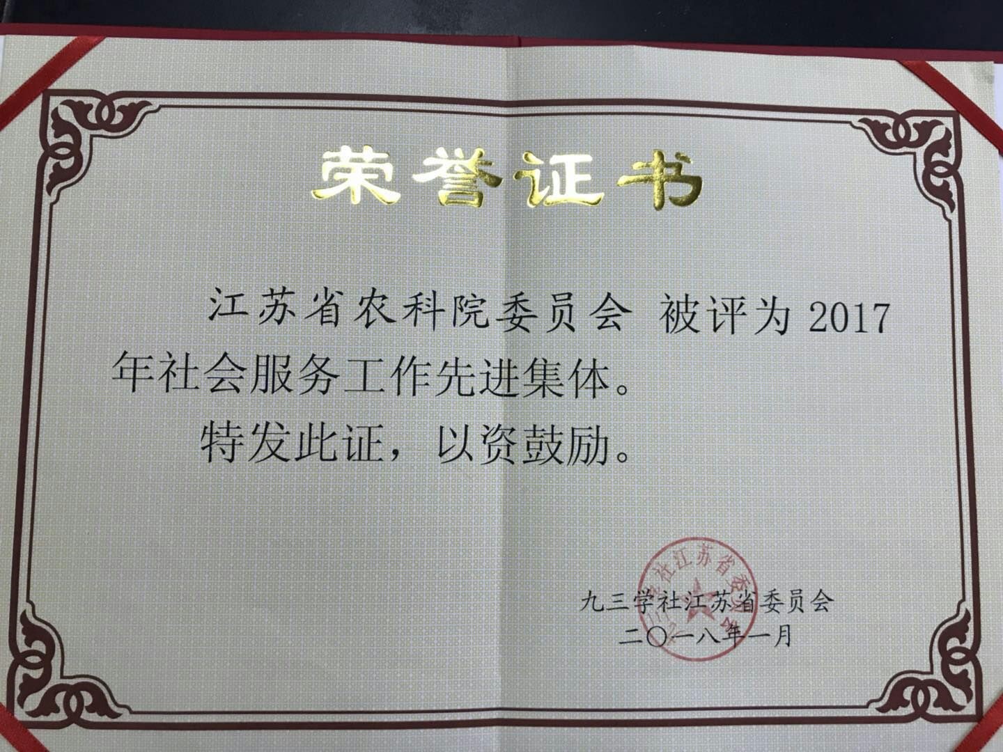 2017年度,九三学社江苏省农科院委员会在社会科技服务、组织建设、思想宣传等方面取得显著成绩,被评为“2017年社会服务先进集体”,张丽霞被评为“社会服务先进个人”,王元琮被评为“思想宣传先进个人”,会上,蒯主委为获奖集体和个人颁发了证书。