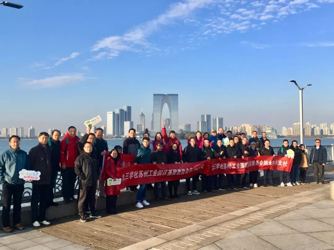 2020元旦的清晨,几天来难得一见的风清气朗。九三学社苏州工业园区基层委员会主办的元旦徒步金鸡湖活动再次出发。为了增加活动的趣味性并履行社会服务职责,每次徒步活动都嵌入公益主题,今年的主题是“保护环境从我做起”,社员们举着环保标语牌沿途宣传垃圾分类、保护地球理念,并向民众发放宣传公益卡。
