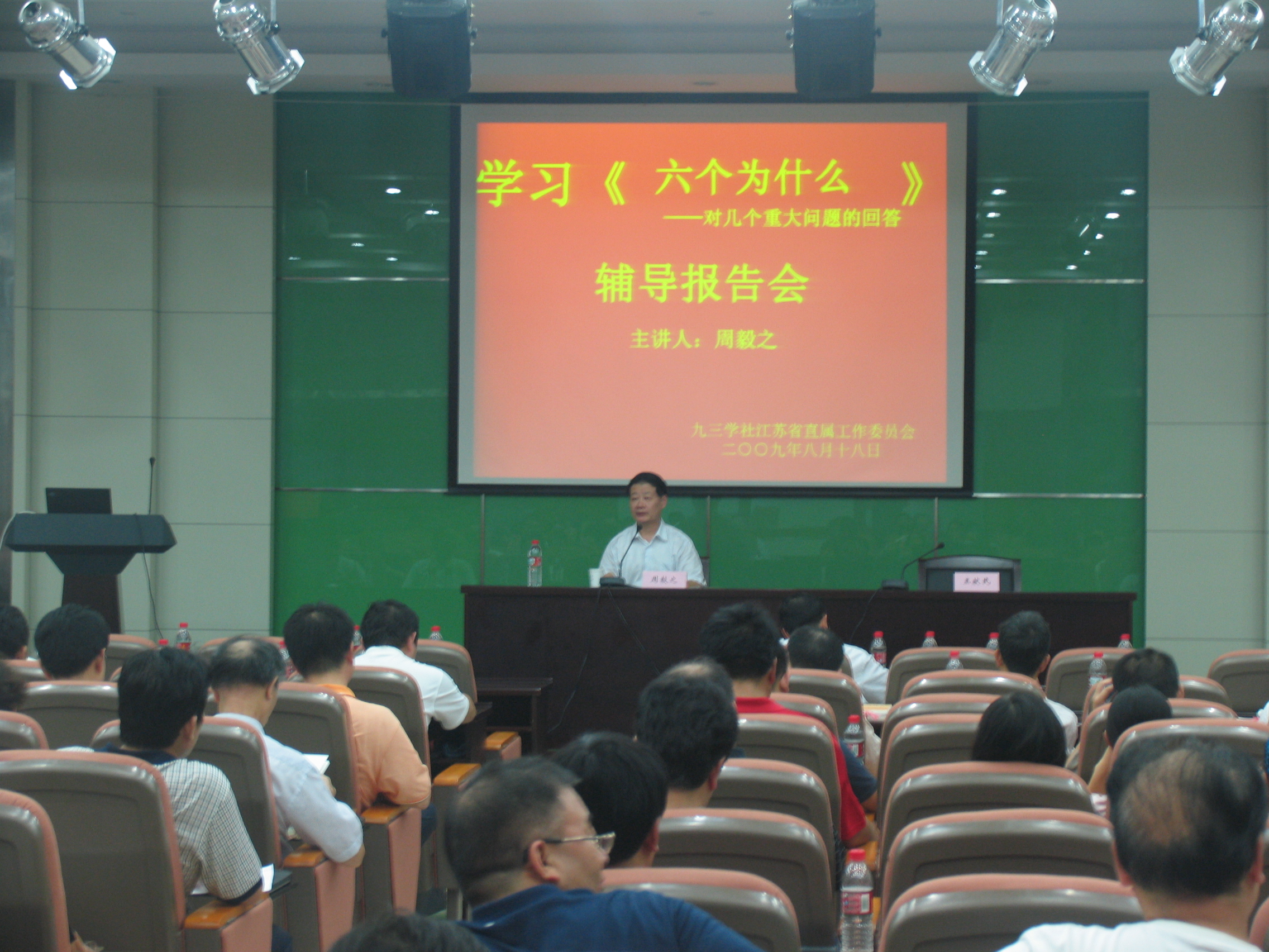 8月18日,学习《六个为什么——对几个重大问题的回答》辅导报告会在宁举行。省直工委邀请曾担任省委党校副校长、省委宣传部副部长,现任《群众》杂志社总编、十七大宣讲团成员的周毅之教授作报告。社省委秘书长王献民,社省委副秘书长、组织处处长冯蜀陉出席此次报告会。省直各基层组织150多名成员参加此次学习。