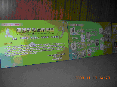 一是利用学校新建大礼堂做国际科学与和平周的宣传展板,主要内容有①介绍国际科学与和平周,②国庆大典,③日新月异,④航天奇迹,⑤爱的奉献,⑥科学之光(西方科学家简介),⑦科学之光(中国科学家简介)⑧和谐之舞,⑨祝福未来。因大礼堂不断组织各种活动,所以该展板发挥了应有的作用,自11月9日(星期一)展出一周以来,观看人数近千人以上,反映很好。