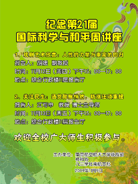九三学社南航大支社根据社省委关于开展和平周的相关通知精神,依托南航雄厚的文化背景,依照第21届国际科学与和平周的主题“弘扬科学,关注民生,发展公益,促进和谐”积极开展科学文化活动。经支委会成员经过认真讨论,决定以宣传展板、文化学术讲座的形式来组织活动。活动的开展宣传了国际科学与和平周,弘扬了科学文化,促进了南航校园文化氛围,提高了九三学社成员的社会责任感,扩大了九三学社组织的社会影响等各个方面都有重大意义。主要做法有: