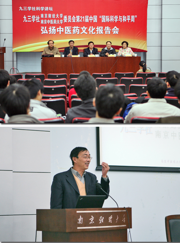 在第21届“国际科学与和平周”到来之际,11月12日下午,九三学社科学讲坛来到了南京财经大学。王旭东教授给南财大师生作了一场“弘扬中医药文化”报告会。报告会旨在弘扬中医药文化、促进国际科学与和平。中共南京财经大学党委副书记、副校长王建明,社省委秘书长王献民,社南京中医药大学委员会副主委张宗明教授等出席了报告会。报告会由社南财大委员会主委、金融学院陶美珍教授主持。