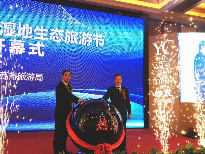 ( 图为许仲梓和赵鹏共同启动’2012中国盐城丹顶鹤国际湿地生态旅游节暨经贸洽谈会开幕式触摸球。)