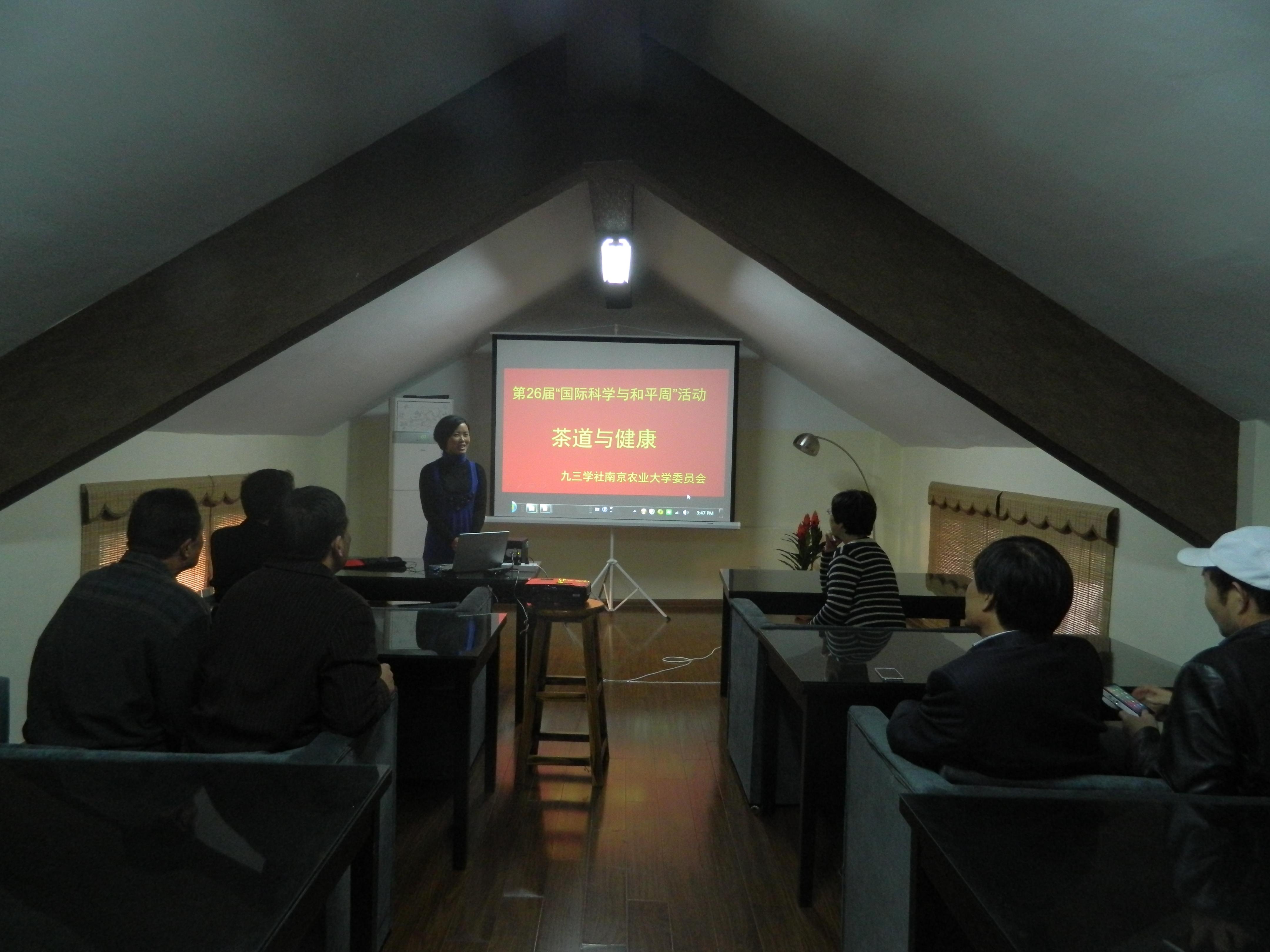 为了响应国家的第26届“国际科学与和平周”倡议,九三学社南京农业大学委员会于11月16日在中山陵茶厂菀园茶学堂举行了主题为“茶道与健康”的科普讲座。邀请的主讲人是南京农业大学九三社员、茶学博士房婉萍副教授。她的报告内容丰富,深入浅出,贴近生活,引人入胜。报告中,提问频频;报告后,讨论热烈。她的报告,让人有收获颇丰、听了还想听的感觉。该委员会的组成成员和各支社的领导成员参加了这次活动。这次活动,对于弘扬中国的茶道文化、提高市民的健康状况、促进市民的养性意识,具有积极意义。