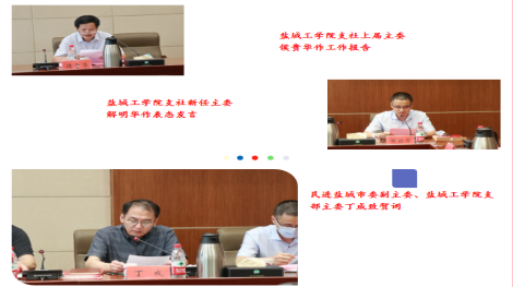 8月30日,九三学社盐城工学院支社换届会议在盐城工学院行政楼会议室隆重召开。盐城市政协副主席、九三学社盐城市委主委孙大明出席会议并讲话。盐城工学院党委副书记薛浩,盐城工学院党委常委、组织部部长倪自银,盐城工学院党委常委、统战部部长姚军,中国民主促进会盐城市委副主委、盐城工学院支部主委丁成到会祝贺。九三学社盐城市委专职副主委陈苏宁及支社社员参加会议。会议听取了侯贵华主委代表上届支社委员会作的近年来工作情况报告,选举产生了九三学社盐城工学院支社新一届领导班子。选举解明华任主委,王进、张文惠任副主委。
